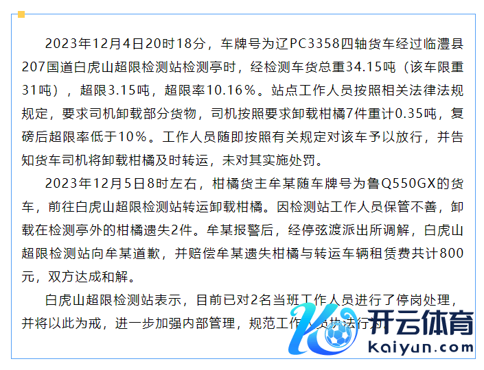 12月6日中午,临澧县委、县政府官方微信号发布情况阐明:2023年12月4日20时18分,车招牌为辽PC3358四轴货车经由临澧县207国说念白虎山超限检测站检测亭时,经检测车货总重34.15吨(该车限重31吨),超限3.15吨,超限率10.16%。站点职责主说念主员按照联系法律法规定程,条目司机卸载部分货色,司机按照条目卸载柑橘7件重计0.35吨,复磅后超限率低于10%。职责主说念主员飞快按照联系章程对该车赐与放行,并奉告货车司机将卸载柑橘实时转运,未对其引申处罚。