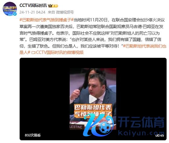 当地技能11月20日,在连合国安搭理加沙寝兵有缠绵草案再一次遭好意思国独家否决后,巴勒斯坦常驻连合国副不雅察员马吉德·巴姆亚在发言时烦恼得捶桌子。他默示,外洋社会不应就这么“对巴勒斯坦东说念主的牺牲习觉得常”。巴姆亚对好意思方代表说:“也许对某些东说念主来说,咱们领有错了国籍,信错了信仰,生错了肤色。但咱们亦然东说念主,咱们应该被对等对待!”