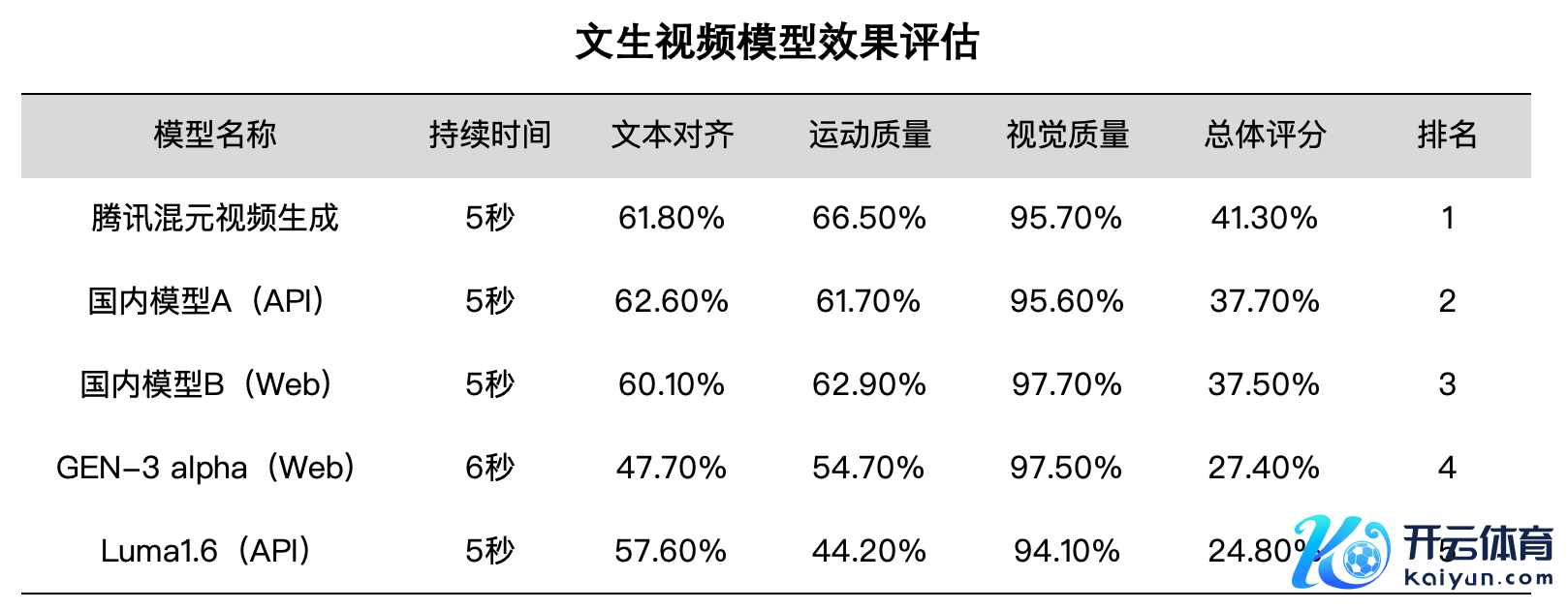 12月3日,腾讯混元大模子上线了视频生成能力,并开源了这个参数目130亿的视频生成大模子HunYuan-Vieo。据称该模子是业界参数最大的开源视频模子,可生成5秒视频。据混元团队公布的文生视频模子成果评估,混元视频生成模子总体评分41.3%,高于未公开称号的国内模子A和B以及国际的GEN-3 alpha和Luma1.6。这项评估参照合手续时辰、文本对皆、通达质地、视觉质地几个维度,显露五个模子评分都不高,最低的Luma1.6评分仅24.8%。