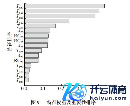 期骗ReliefF去除无用要的特征有助于普及模子的分类准确率。以ReliefF算法计较锻真金不怕火蚁集16 个LFNMR弛豫特征信息对最终分类标签的紧迫性并列序,效果如图9所示。权重不错反应特征与分类标签之间的关系性。图9标明,TS23权重最大(0.43),说明其在油样的分类中施展紧迫作用,而TP21权重最小(0.02),说明其对样本永别的孝顺最小。此外,权重排序前3的特征信息(TS23、TE23、TP23)均与T23峰关系,且7 个分类标签(图8旅途a)中均存在T23峰,说明T23峰弛豫特征的存在有助于CAO掺兑样本的永别。而权重排序的后3 位(TP21、TS21、TE21)均与T21峰关系,说明该弛豫峰在油样分类中的作用相对较小。