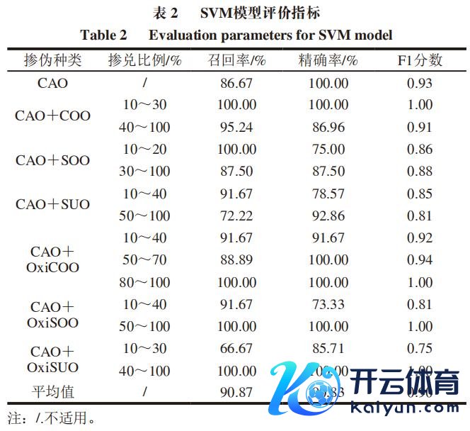 进一步就SVM模子对CAO及6 种二元掺兑体系的分类精度进行评估。分别将不同类别及掺兑比例油样视为阳性(正类)样本,其他油样视为阴性(负类)样本,计较调回率、精准率、F1分数,效果如表2所示。