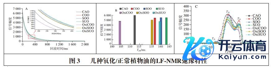图3A标明,OxiCOO衰延缓率最快,起首衰减统共;SUO的衰延缓率最小,衰减统共所需时候最长;其余样品均介于SUO和OxiCOO之间,从上往下秩序是SOO、OxiSUO、COO、OxiSOO、CAO。图3B的单组分弛豫图谱也标明,SUO的T2W(143.14 ms)最大,而OxiCOO的T2W(104.26 ms)最小,其他油样的T2W介于SUO和OxiCOO之间。图3C则标明,CAO的多组分图谱与其他6 种油互异显豁,CAO只消T21和T22峰,而其余6 个油样均出现3 个弛豫峰,且与平淡油样比较,氧化油样的弛豫峰显豁左移。以上效果标明不同油样的弛豫特质具有一定辞别。