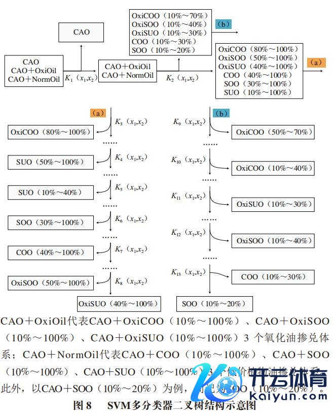 合理的结构盘算能有用缩小SVM多分类历程中的“舛错累计”,普及模子的分类精度。基于对各油样的LF-NMR弛豫特质的比较及PCA的效果盘算CAO掺兑识别的SVM二叉树结构分类器,图8中的SVM二叉树分类器由13 个二分类SVM构成,领先通过核函数K1(x1,x2)构建二分类器可竣事CAO和掺兑样品的永别。再基于是否存在T23峰这一显耀特征,以核函数K2(x1,x2)构建二分类器,初步竣事低比例和高比例掺兑的永别。随后,分别以核函数K3(x1,x2)~K13(x1,x2)构建多个二分类秩序竣事不同掺兑类型、掺兑比例的永别。最终形成的分类标签如图8的通盘叶子节点所示(灰色艳丽部分),觉得14 个分类标签,涵盖CAO、掺兑油类型、掺兑比例信息。