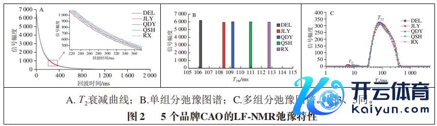 图2A标明,各品牌CAO的T2衰减弧线实在疏导,均以最大信号幅度(6 275.95±111.41)开动衰减并在1 300 ms傍边衰减统共。图2B中,CAO的单组分图谱(T2W)分散在106.55~112.35 ms,互异较小,图2C的多组分弛豫图谱均呈典型双峰分散,其中,T21峰位于5.13~15.69 ms,T22峰位于31.23~449.57 ms。各品牌的LFNMR特质相符度较高,这是由于食用油的LF-NMR弛豫特质与其脂肪酸碳链长度和主要脂肪酸含量密切关系,这有助于后续与其他植物油及掺伪样品永别。