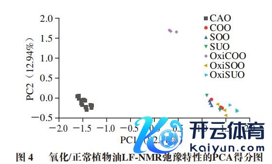 对7 种氧化/平淡植物油的LF-NMR弛豫特质进行PCA,PC1、PC2孝顺率分别为82.16%和12.94%,累计孝顺率为95.10%,标明这两个PC也曾涵盖了原始数据的绝大部分信息,PCA分散如图4所示。CAO蚁集分散在图的左下方,其他6 个油样则分散在图的右侧,且具有一定互异,举例OxiCOO分散在图右上侧位置、OxiSUO分散在图的最右侧。PCA效果标明,基于样品的LF-NMR索要的特征值不错有用永别CAO和其他植物油及氧化油脂。