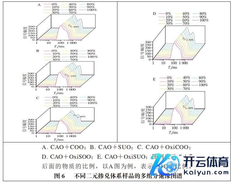 图6为其余5 个掺兑体系的多组分弛豫图谱。不错发现,跟着其他油样掺兑比例的增多,样品均会出现T23峰,但这与各体系的掺兑比例密切关系。举例,当SUO比例在10%及以上时,CAO+SUO体系的多组分弛豫图谱阐扬为三峰结构,而COO掺兑比例在40%及以上时呈现三峰结构;对氧化油样掺兑的样品而言,当OxiCOO掺兑比例在80%及以上时,CAO+OxiCOO体系的多组分弛豫图谱阐扬为三峰结构,而OxiSOO、OxiSUO掺兑比例分别在50%、40%及以上时样品的多组分弛豫图谱呈三峰结构。此外,跟着掺兑比例的增多,3 个二元氧化掺兑体系的多组分弛豫图谱分散均相对左移。
