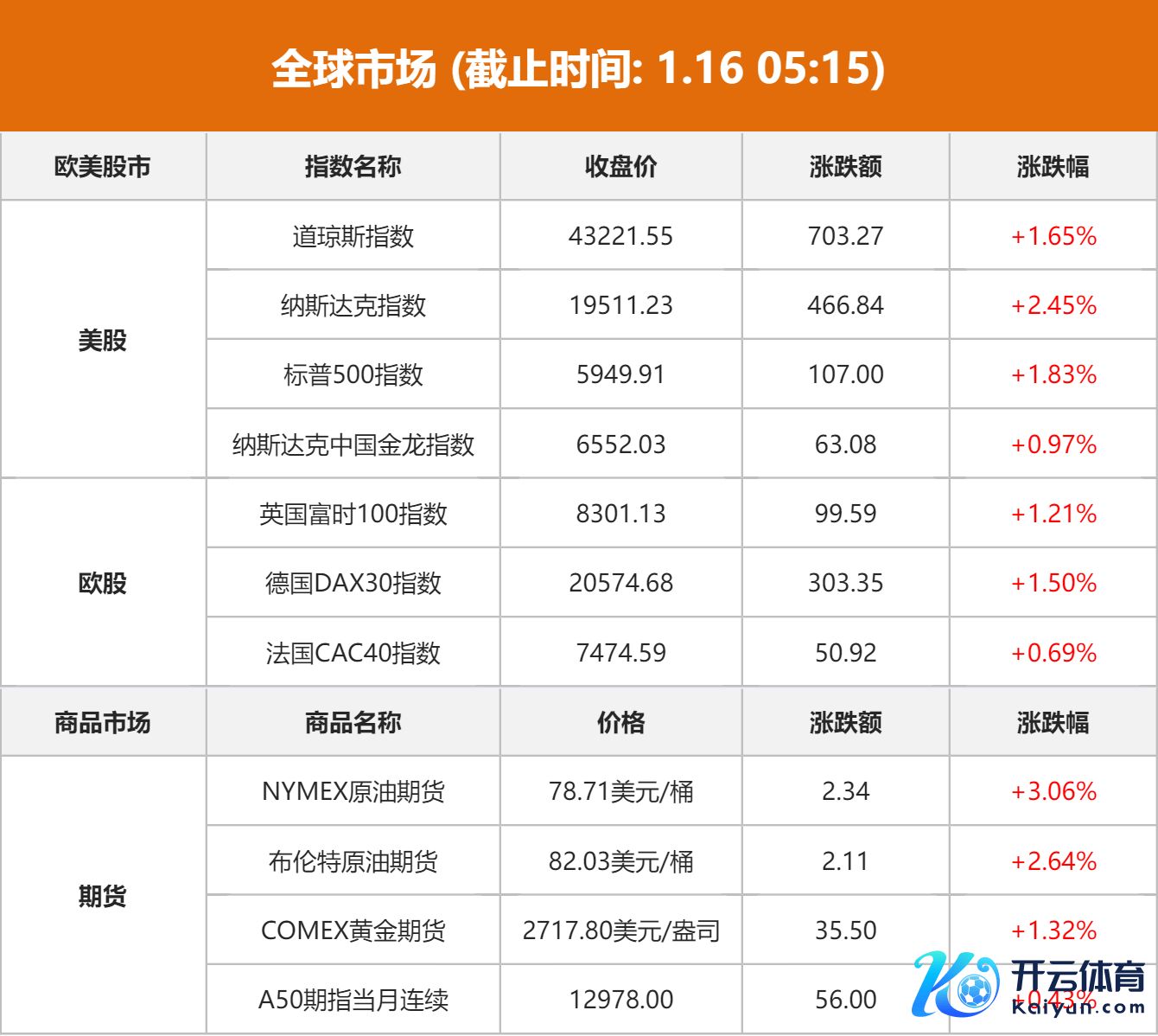 好意思股:纽约股市三大股指15日上升,为止本日收盘,说念琼斯工业平均指数比前一交往日上升703.27点,收于43221.55点,涨幅为1.65%;措施普尔500种股票指数上升107.00点,收于5949.91点,涨幅为1.83%;纳斯达克详尽指数上升466.84点,收于19511.23点,涨幅为2.45%。
