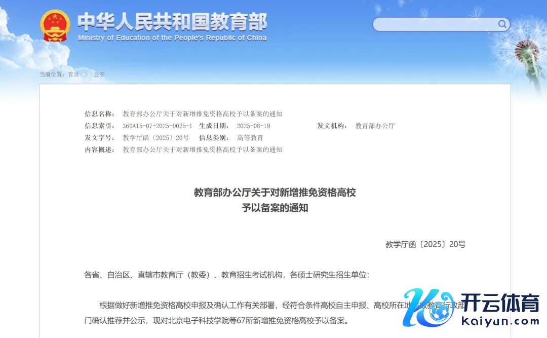 把柄作念好新增推免阅历高校汇报及说明责任相关部署,经适应条目高校自主汇报、高校场所地省级讲授行政部门说明保举并公示,现对北京电子科技学院等67所新增推免阅历高校给予备案。
